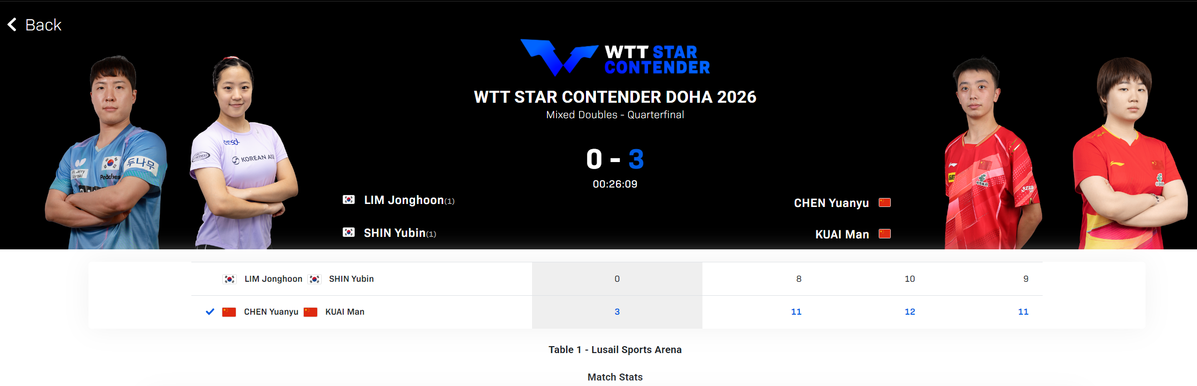 北京时间1月16日,WTT多哈球星挑战赛混双1/4决赛,国乒组合蒯曼/陈垣宇3-0横扫韩乒组合林钟勋/申裕斌,三局比分:11-8,12-10,11-9。没想到世界第二的混双组合林钟勋/申裕斌止步八强,国乒全新的混双组合蒯曼/陈垣宇完成了一场爆冷。