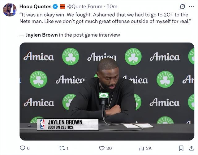 布朗:能拿下这场胜利还算不错,我们奋力拼搏了。遗憾的是我们不得不鏖战两个加时赛才击败篮网。你们也知道除了我之外,我们队内没有太多进攻出色的球员。