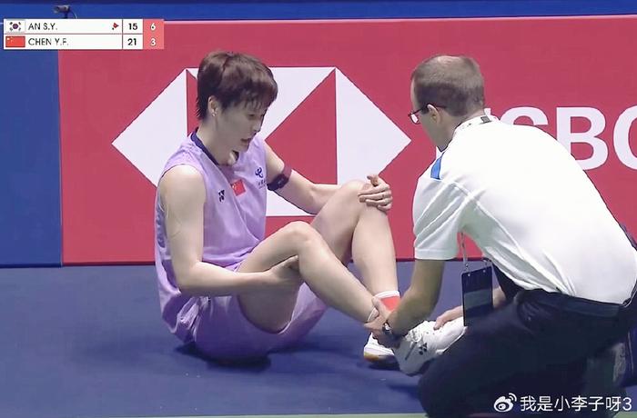 本场比赛,首局,陈雨菲一上来就打得很主动,通过斜线杀球和高质量的进攻连续得分,迅速将比分拉开至7-2,安洗莹则是试图提速反击,将比分追至7-9,但陈雨菲顶住压力,通过近距离重拍和精准的回球,11-7再度拉开分差,当安洗莹追至13-15时,陈雨菲再次发力连得3分,以18-13重新确立优势,随后陈雨菲继续保持,以21-15先胜一局。第二局,安洗莹发起反击,开局阶段一度领先,同时也出现了意外情况,陈雨菲在一次后退击球过程中右脚意外崴伤,被迫叫了医疗暂停,经过简单处理后,陈雨菲咬咬牙继续比赛,安洗莹趁势进攻,以7-3领先,不过陈雨菲并未放弃,而是通过放网前球得分和多拍对抗把比分追平,进入下半局后,陈雨菲突然提速,连续进攻得手,局末安洗莹更是已经乱了阵脚,最终陈雨菲以21-17锁定胜局。