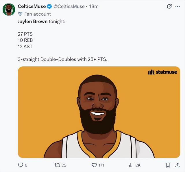 就连前NBA球员克里斯-波什也在播客节目中盛赞杰伦-布朗已经打出了MVP级别的水准。