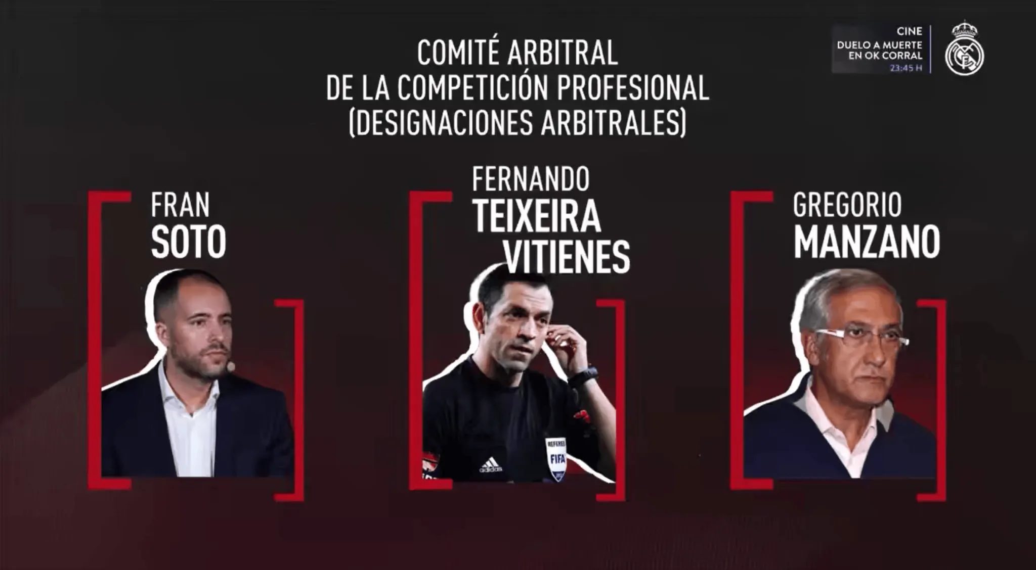 虎扑04月26日讯 皇马TV近期多次对球队在欧战及西甲比赛中遭遇的不利判罚表达不满,此次节目中再次将矛头指向西甲裁判指派机制,对相关人员及多场争议判罚进行了集中梳理。据皇马TV披露,西班牙职业比赛裁判委员会负责每轮联赛裁判指派,目前由三人组成,分别是弗兰-索托、费尔南多-特谢拉-比蒂内斯以及格雷戈里奥-曼萨诺。