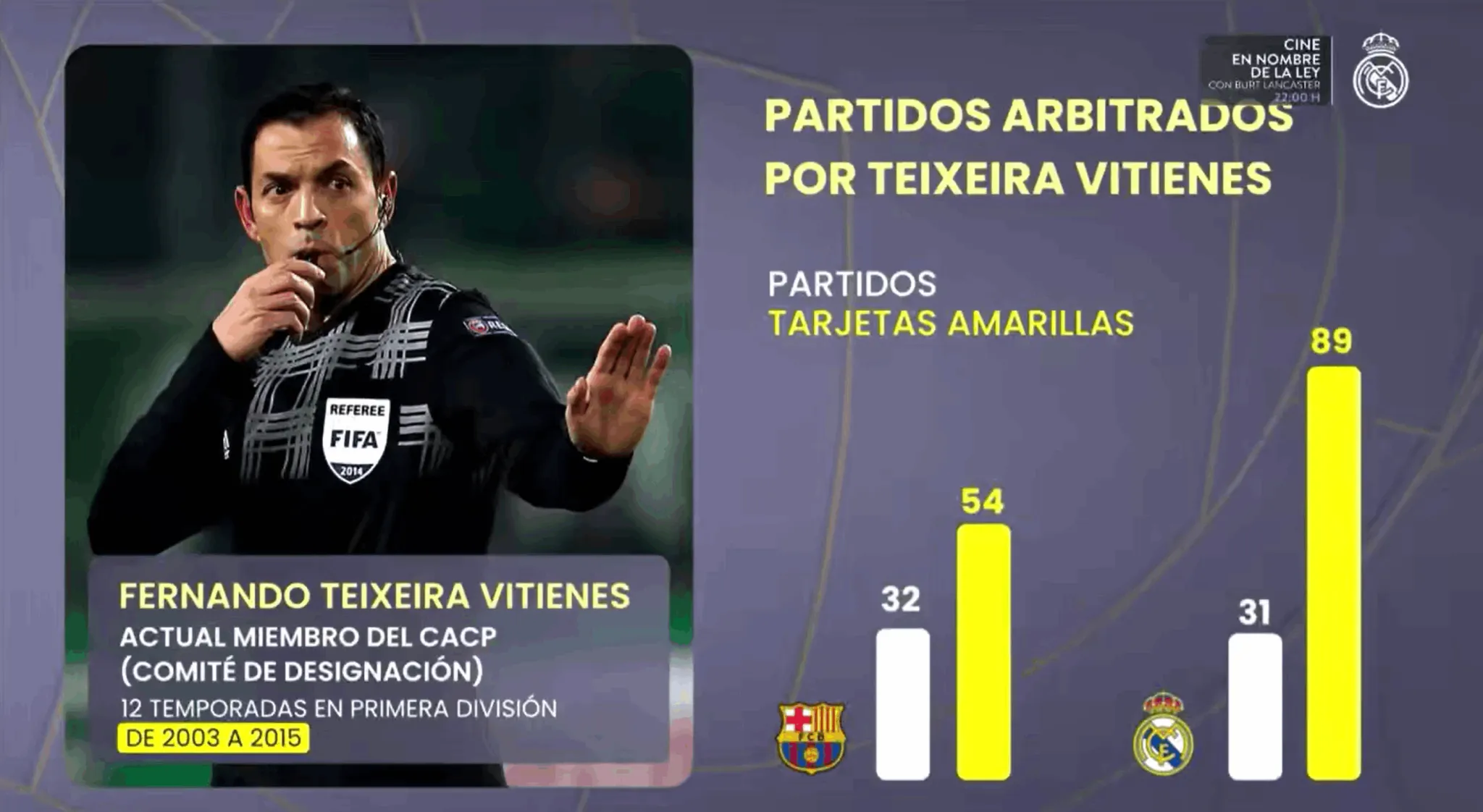 皇马TV表示,他在执法生涯中留下了一个“统计学上的异常”:执法巴萨32场共出示54张黄牌,执法皇马31场则出示89张黄牌。节目还回顾了他在一场国王杯国家德比中的多次争议判罚,包括未判布斯克茨手球、未判阿比达尔禁区内手球、取消皇马的进球以及未判普约尔对本泽马犯规等,皇马最终以一球之差被淘汰。此外,在一场比利亚雷亚尔对阵巴萨的比赛中,他曾向布斯克茨出示两张黄牌却未将其罚下。