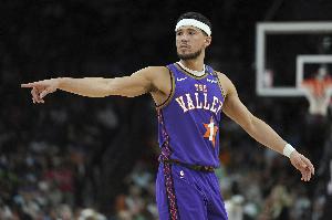 本场比赛,太阳球星布克表现还可以,下半场虽然手感不佳但命中准绝杀跳投,在40分钟的时间里,投篮18中7,三分球5中0,罚球5中5,拿到19分7篮板12助攻的数据,有5次失误,正负值+13。